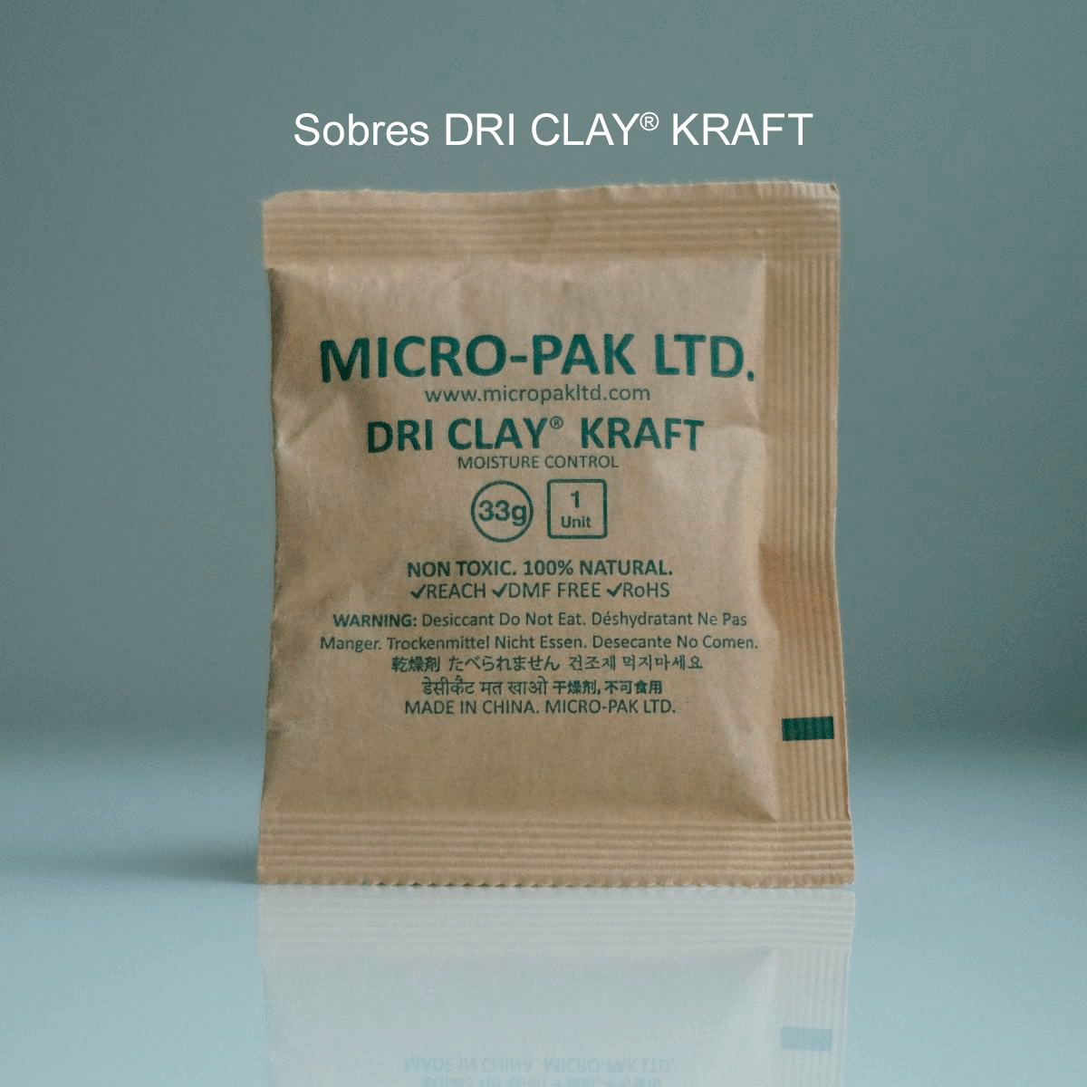 Micro-Pak DRI CLAY® KRAFT es un desecante 100% natural, libre de plástico y biodegradable hecho de arcilla bentonita de alto grado y empaquetado en papel Kraft certificado FSC (Forest Stewardship Council).